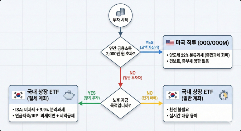 Logic: 금융소득종합과세를 회피하고, 건강보험료 이슈를 차단하며, 달러 자산을 직접 보유하여 리스크를 헷지하십시오. QQQ보다 보수가 낮은 QQQM(0.15%)을 추천합니다.