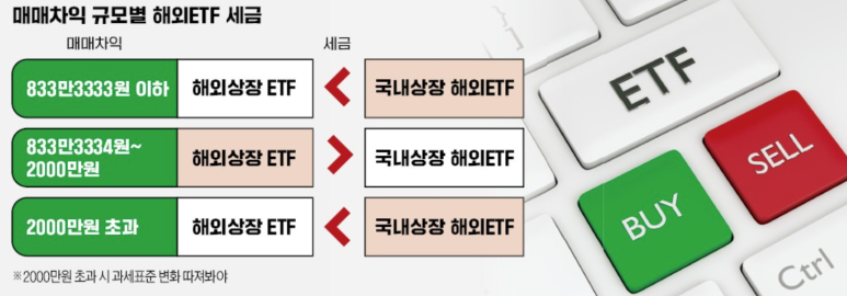 국내 ETF는 A종목 수익에 대해 15.4%를 징수하고, B종목 손실은 보전해주지 않습니다(손익 통산 불가). 단, 2025년 이후 금투세 도입 여부에 따라 변동 가능성이 있었으나, 폐지 시 현행 유지.