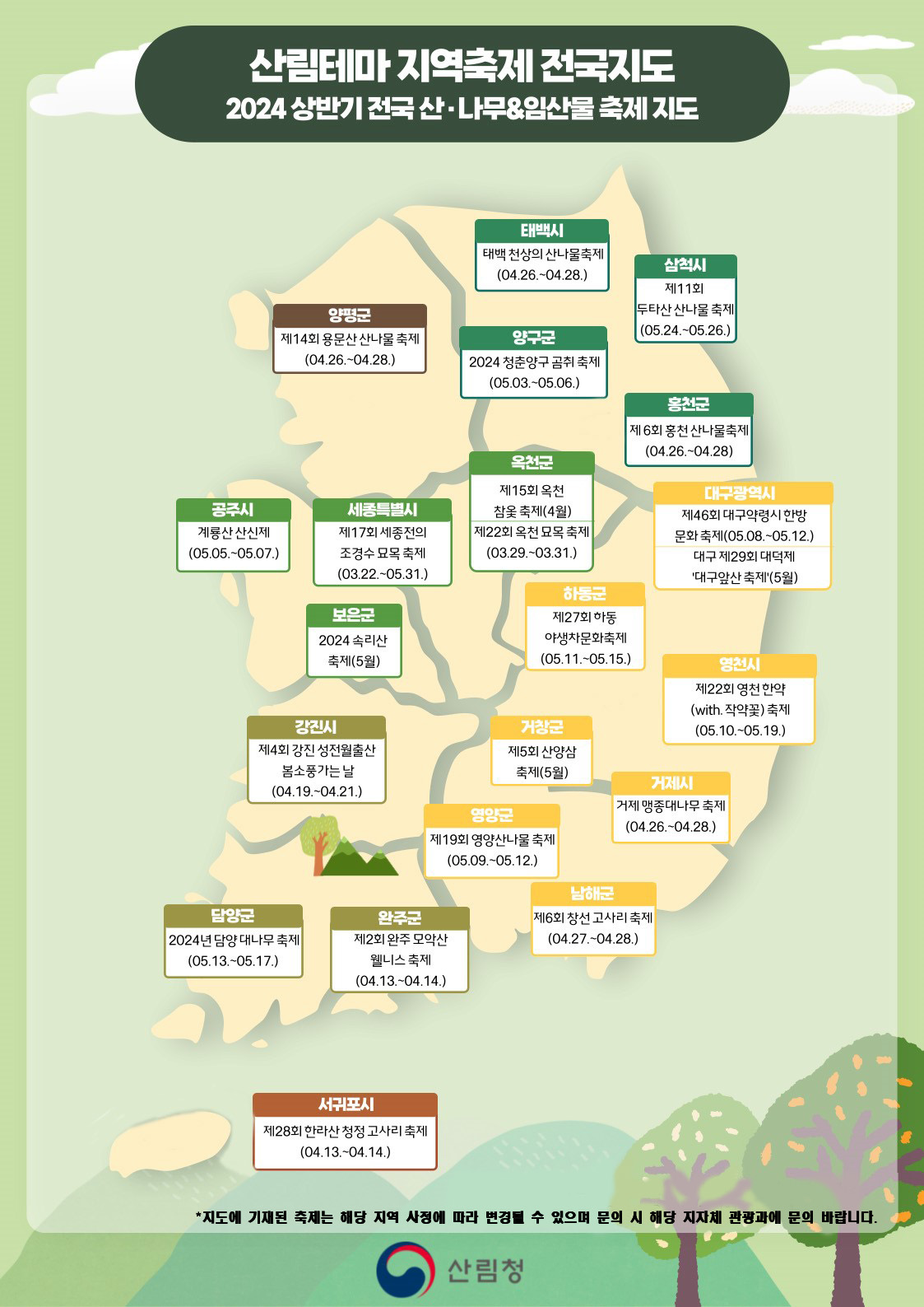 산림청은 본격적인 지역축제 개최에 앞서 ‘산림테마 지역축제 전국지도’를 제작해 올해 상반기 동안 산림과 관련된 지역축제 정보를 제공한다. 대표적으로 3~4월에는 대전 대청호 봄축제와 서귀포 유채꽃 축제, 5∼6월에는 담양 대나무 축제와 영양 산나물 축제 등이 예정되어 있다.
