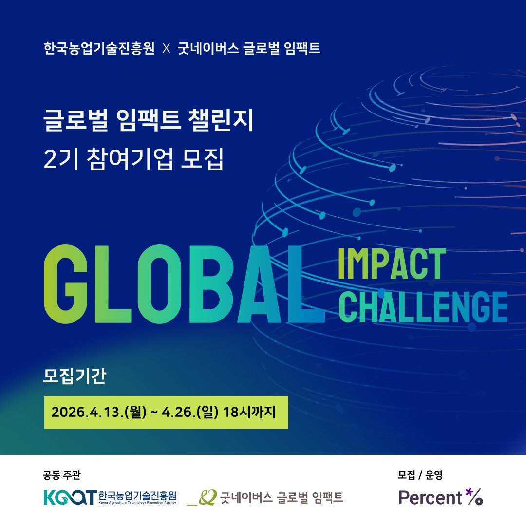 2026년 4월 13일 -- 굿네이버스 글로벌 임팩트와 한국농업기술진흥원(이하 농진원)은 개발도상국 농식품 현장의 과제 해결에 적용 가능한 기술과 사업모델을 보유한 스타트업을 대상으로 ‘글로벌 임팩트 챌린지 2기’ 참가기업을 4월 13일부터 26일까지 모집한다고 밝혔다.